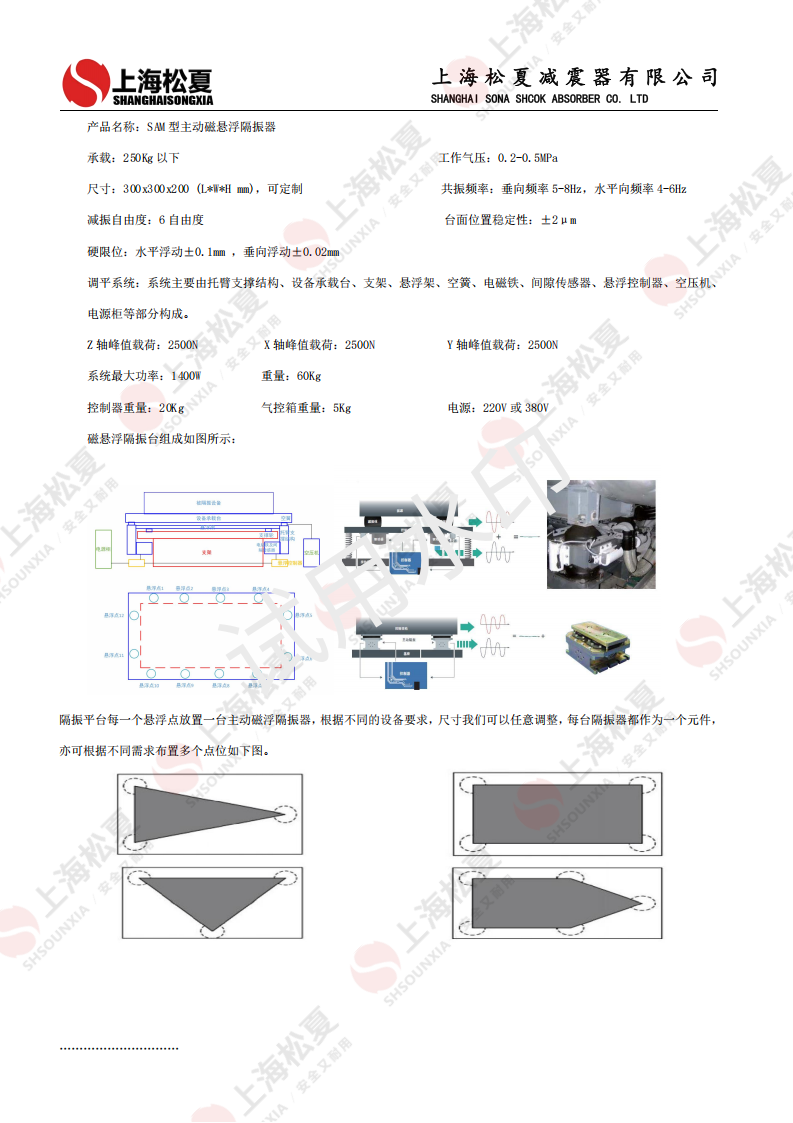 松夏SAM型主动隔振器(Active Vibration Isolators)是一种利用电子控制系统实时调整以抵消振动的设备。它们通过传感器检测振动,然后由控制器计算出所需的反作用力,并通过执行器施加相反方向的力来抵消振动。由于其复杂性和成本较高,主动隔振器通常被用于那些对振动极其敏感或传统被动隔振方法难以有效处理的关键部位。
